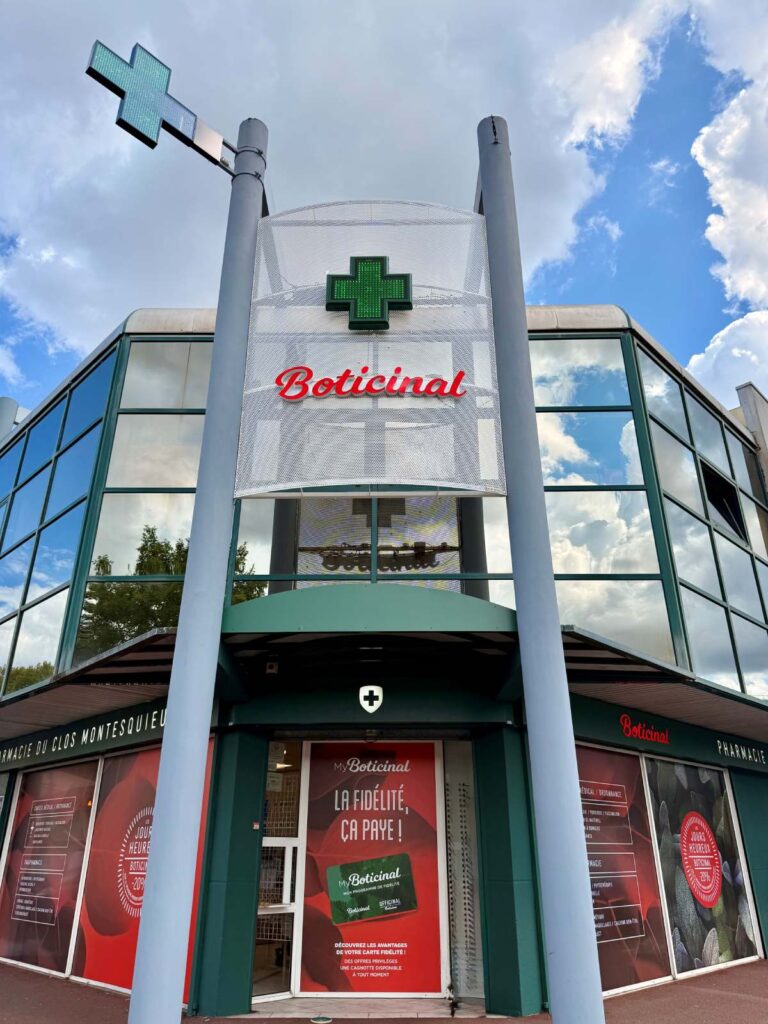 La pharmacie Boticinal se reconnaît au premier regard. Signalétique claire, la croix, le blason, les codes de la marque pour renforcer la visibilité de la pharmacie.